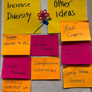 Participants sat in groups of 4-5 to answer three rounds of questions. Between each question, people switched tables, giving them an opportunity to listen and share with a different set of thoughts and perspectives. The questions were: